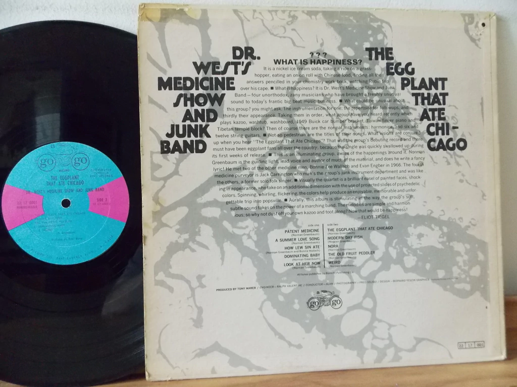“Mais estranho que a Jim Kweskin Jug Band e mais alinhado com a tradição de banda folk/jug do que os Holy Modal Rounders, o Dr. West's Medicine Show & Junk Band estava entre os grupos mais notáveis dos anos 1960 que atualizaram o espírito da banda folk/jug com uma atitude moderna e influências do rock. Mais conhecido como o ponto de partida para o líder e compositor chefe Norman Greenbaum (não havia "Dr. West"), que teria um grande sucesso no rock em 1970 com "Spirit in the Sky", eles não alcançaram nem o perfil modesto de Kweskin ou dos Holy Modal Rounders. Greenbaum certa vez se descreveu como "um cruzamento entre Captain Beefheart e Spike Jones", e enquanto Dr. West soava muito mais como Jones do que Beefheart, Greenbaum e seus companheiros certamente tinham um talento para músicas espirituosas, muitas vezes absurdas, no estilo jug band moderno. No palco, Dr. West fazia perfomances entre as músicas, um truque que até atraiu elogios de Frank Zappa. O único álbum de Dr. West, The Eggplant That Ate Chicago, estava lotado de músicas com estranheza blasé, como a faixa-título, que seria feita sob medida para ser tocada no programa do Dr. Demento alguns anos depois. Alguns singles pós-álbum viram Dr. West preenchendo seu som com arranjos mais com sabor de rock que se encaixavam com folk-rock e psicodelia leve, embora o foco lírico permanecesse fora do comum, com músicas sobre uma prostituta de Nova York ("Bullet La Verne") e "Gondoliers, Shakespeares, Overseers, Playboys e Bums". AMG.